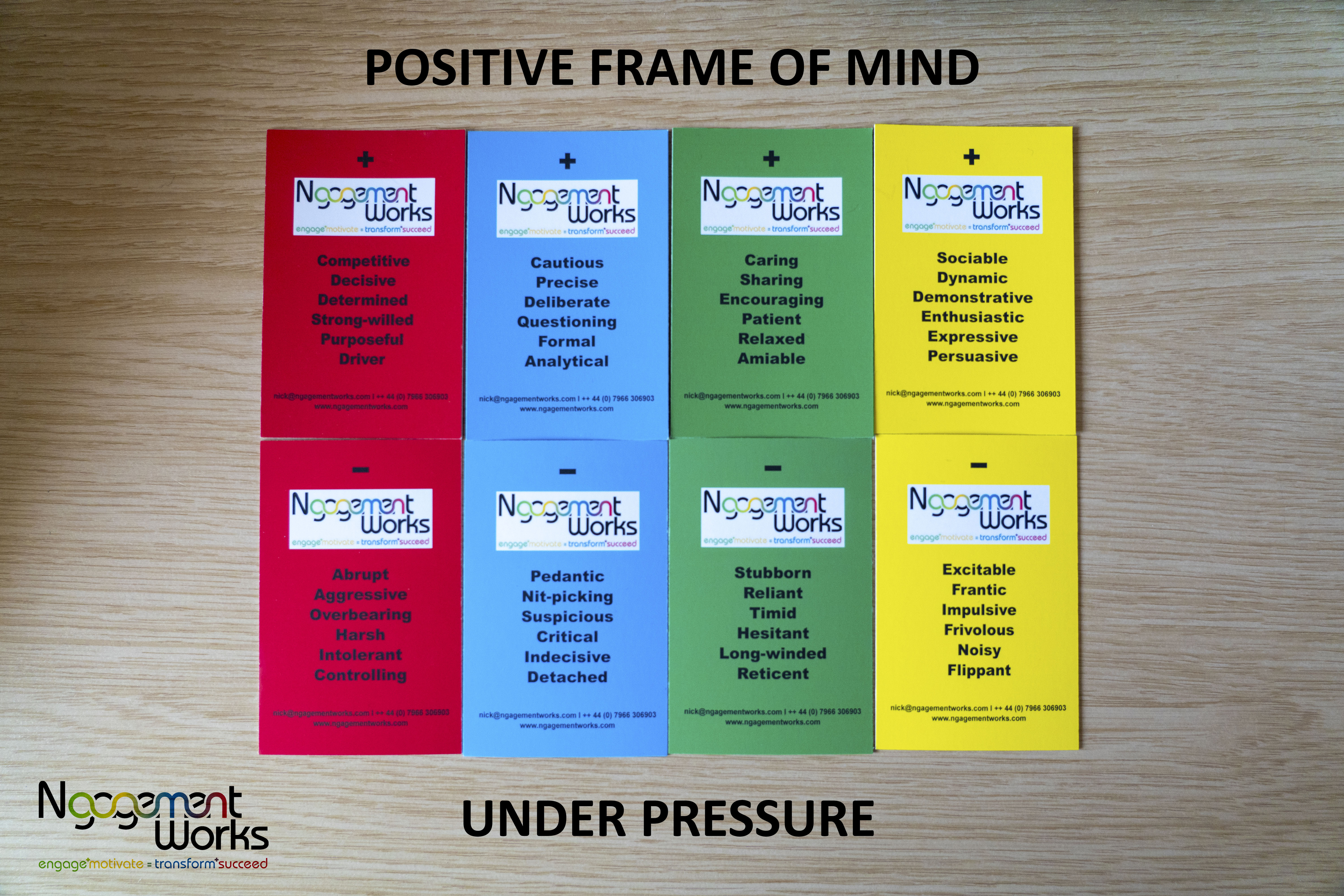 When we find it too much for us, we often start to exhibit “Under Pressure” behavioural traits. The image below shows the “Positive Frame of Mind” and “Under Pressure” adjectives of the four, high-level behavioural preferences. The majority of people use a combination of two, so it may be that you will associate with a combination of adjectives on two of the cards, more than from the others.
