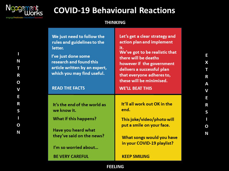 For me, the key learning is that we need to be aware and appreciate, that there is no right or wrong way in which people are reacting and behaving during this current pandemic. They are likely to do so based on their behavioural preferences. Rather than being frustrated by these behaviours because they are not the same reactions you are having, we must understand, support and appreciate that, if they are behaviourally different to ourselves, their reaction will also be different.